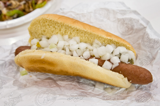 Lunch: Costco lunch - Polish sausage and a slice of combination pizza