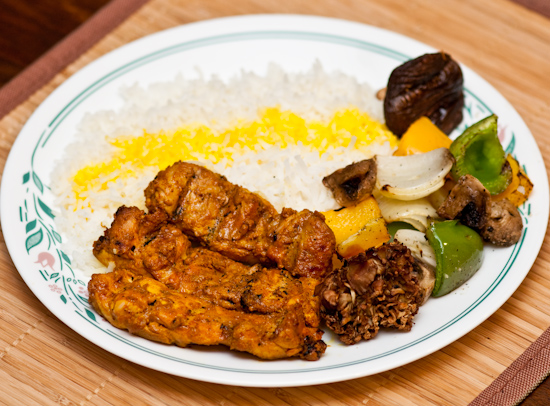 Dinner: I fired up the Big Green Egg and grilled chicken thighs that I marinated in Greek yogurt seasoned with tandoori spices. I also grilled oyster mushrooms and shiitake mushrooms, and vegetable skewers. I served it all with Persian saffron rice.