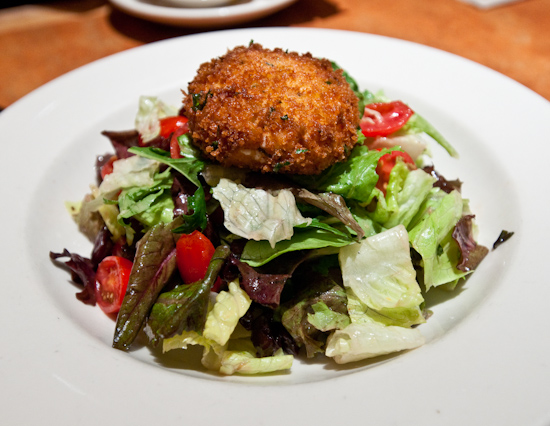 We tried a new salad - the Warm Goat Cheese Salad (crisp goat cheese fritter, organic baby greens, romaine lettuce, grape tomatoes, spiced almonds, dried cherries and champagne vinaigrette). This is our new favorite salad - we liked it even more than the beet salad which we enjoyed so much before. The warm fried goat cheese has a great crunchy texture and smooth creaminess that blends really well with the cold acidic tomatoes. The greens are crisp and refreshing and everything is bound together nicely by the gently tart sweetness of the dressing and dried cherries. We had our almonds on the side (worried about it being overly spiced), but soon tossed them into the salad for that extra nutty crunch. It's good - very, very good.