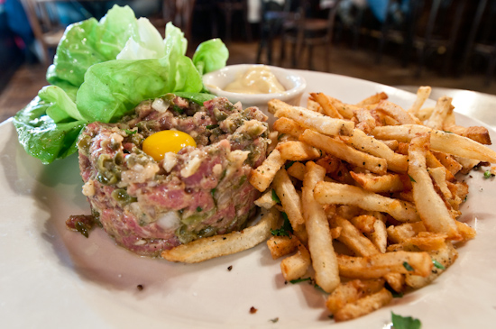 I had the Steak Tartare the classic. handcut ground all natural steak, served cru with a raw egg on top which came with quite a large serving of garlicky and spicy steak and a perfect little quail egg yolk. The fries that came with it were an excellent example of good shoestring fries.