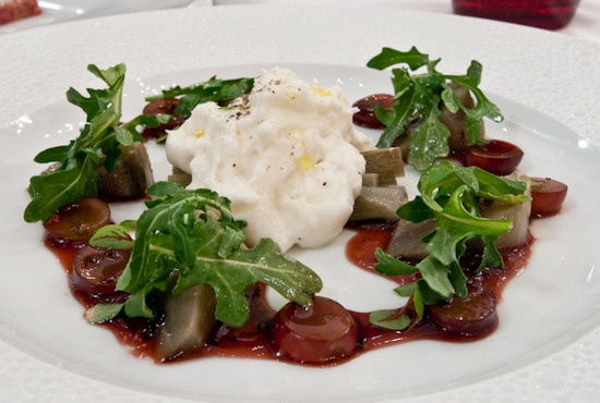 Wild Arugula - Artichoke Confit - Burrata - Red Grape Agro Dulce. The artichoke was cooked sous vide to produce firm but fully cooked artichoke hearts that were not diluted with water via steaming or boiling. The burrata (as in our appetizer at the bar) was refreshingly creamy and worked beautifully with the mild arugula, sweet grapes, and artichokes to form a perfect salad.